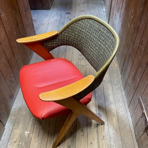 Teak stol med rødt/hvid kunstlæder. Man sidder fantastisk i den. Sædet skal lige repareres fortil (se billede) eller læg et tæppe eller et skind på sædet. Derfor den lave pris. Leveres ikke.