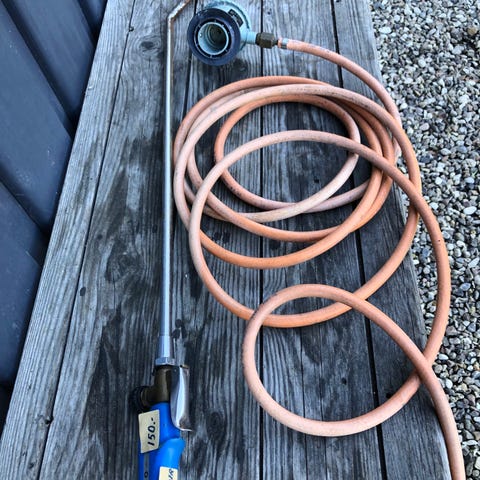 Gasbrænder med langt skaft og bøjet håndtag, nem at styre når du arbejder. Der følger en ekstra gasdåse med på billedet.