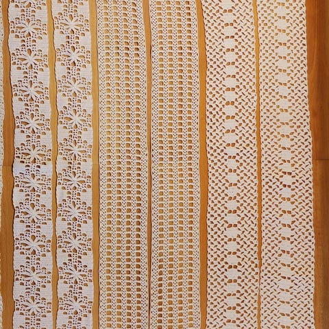 Samling af forskellige kniplede og orkis blonder og bånd i lyse nuancer