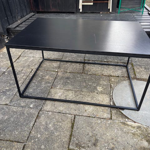 Sort sofabord med træplade og stålben. Mærket er ukendt.