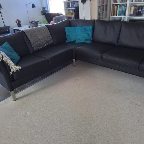 Skalma modula hjørnesofa med chaiselong i cognac farvet semi-anilin læder og nakkestøtte 238*215. Alle hynder er løse, men sidder fast med velcro (fra fabrikken). Lynlås i alle, så indvendig pude kan udskiftes. Den er knap 2 år gammel, så brugt, men i rigtig rigtig god stand. Fejlkøb, pga. min mands helbred. Siddehøjde 41 cm.