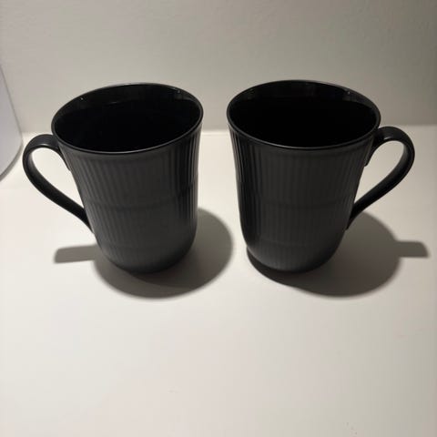 Royal Copenhagen krus med sort grafisk mønster og gule detaljer. Har hank og stempel i bunden som vist på billederne.