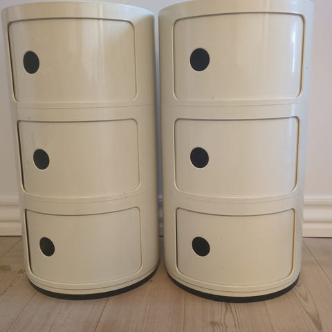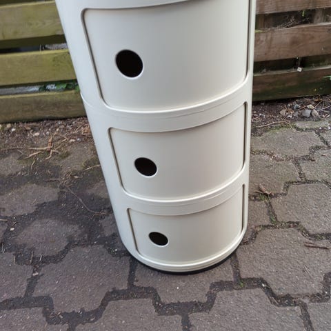 Kartell Componibili opbevaringsmodul designet af Achille Castiglioni med tre runde skuffer. Hvid model med sort top, god som lille skab eller sengebord.