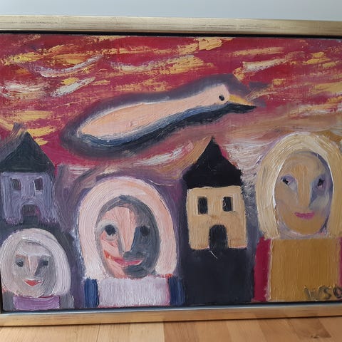 Sjovt maleri med farverige figurer, der står på række ved en bænk. Malet på lærred og klar til at hænge op på væggen.