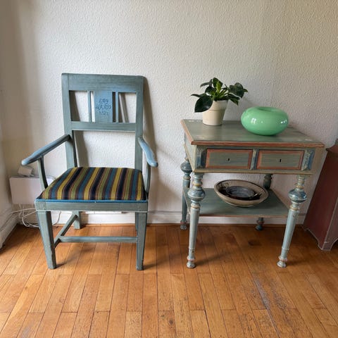 Fin stol med træstel og armlæn, polstret sæde i stribet stof i grønne og lyse nuancer. God som ekstra stol ved bordet eller som enkeltstående stol i et hjørne.