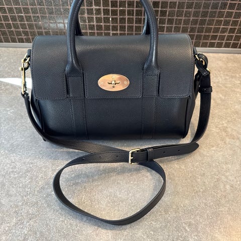 Mulberry taske i smuk mørkeblå læder med hank og justerbar skulderrem. Sølv hardware. Rummelig med mange rum. Har 2 lynlås foroven, indvendig lynlåslomme og ekstra rum til småting.