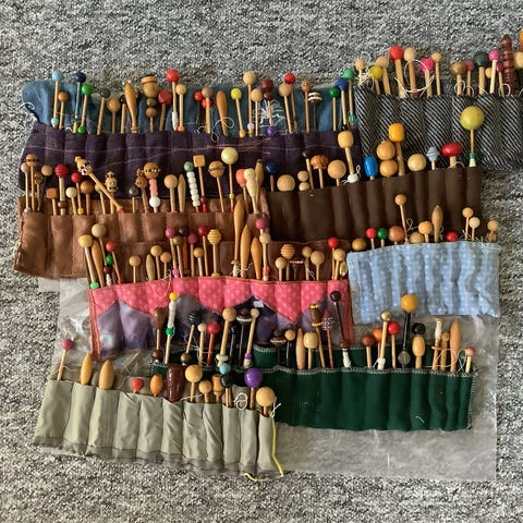 Samling kniplepinde og knipleudstyr
