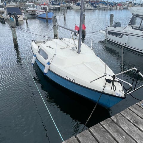 18.000,- DDK, inkl sejl og vogn. Stærk mast i kulfiber. Sejl skal nok skiftes hvis den skal bruges til konkurrence, men ellers medfølger alt så den er sejlklar