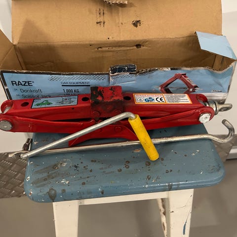 Rød lavprofil donkraft med løftekapacitet på 2 ton. Har langt håndtag og hjul, så den er nem at rulle ind under bilen.