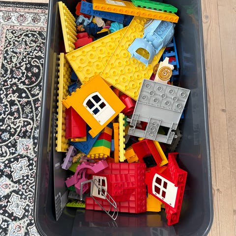 Stort mix af gamle og nye LEGO DUPLO klodser, figurer og især forskellige køretøjer, byggeplads, brandstation osv. De nyere sæt skulle være nogenlunde komplette (jeg har ikke samlet sættene helt på billedet blot lavet et udsnit). Der er delvist instruktioner til de nyere sæt, men instruktioner findes dog også på LEGO’s hjemmeside. Trænger til en tur i opvaskemaskinen.
