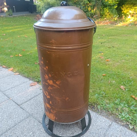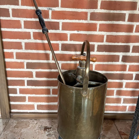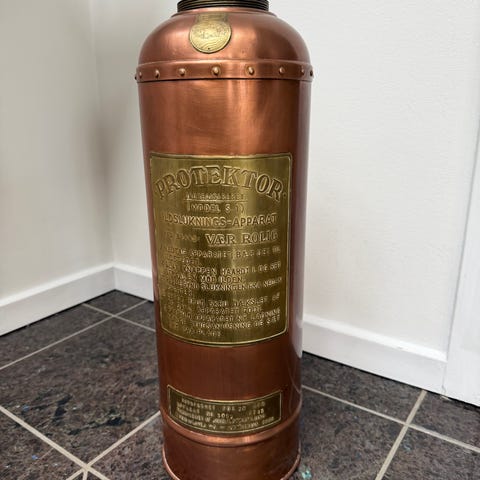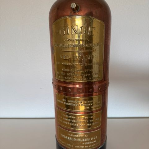 Gammel Ginge brandslukker i metal med store messingplader og tekst på siden. Fin som dekorationsgenstand, fx til garage, værksted eller man cave.