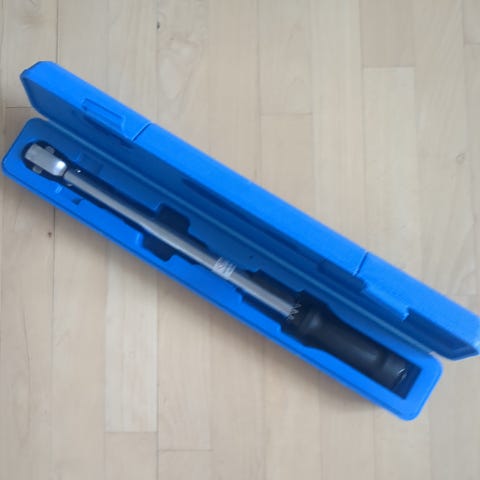 momentnøgle med klik-hoved, ligger i hård plastkasse. Med forlænger og løs top, klar til brug i værkstedet eller garagen.