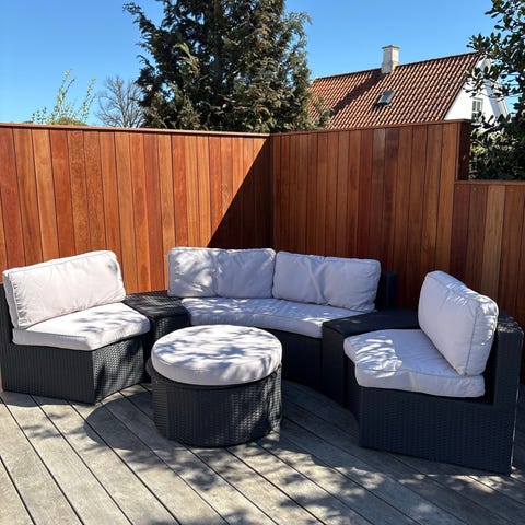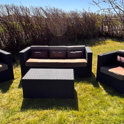 Sort loungesæt i polyrattan med by sofaer, stole og borde