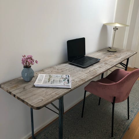 Virkeligt gedigent skrivebord i træ og laminat - stellet er et porsa alustel som man også kender det fra akvarier. Enkeltdelene kan således skiftes ud hvis det bliver nødvendigt.
