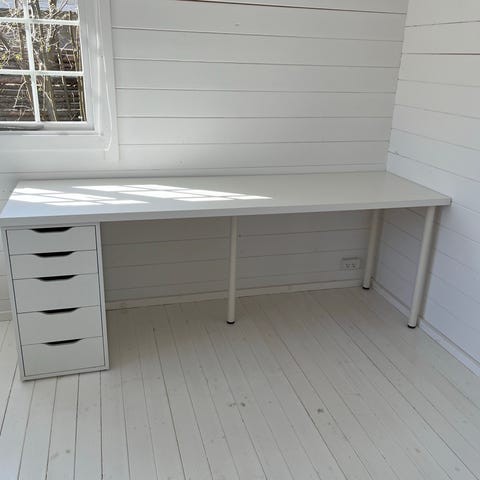 Solidt industrielt skrivebord med to gange fem skuffer. Bordet er 240 cm bredt, og man kan derfor sidde to ad gangen ved det. Bordet er fra 90’erne og har oprindeligt stået på Hvidovre Apotek - et unikt bord man nok ikke finder flere af.