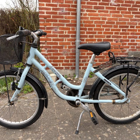 Kildemoes børnecykel med 20" hjul i sort med lilla detaljer. Har kurv foran, bagagebærer og kædeskærm.