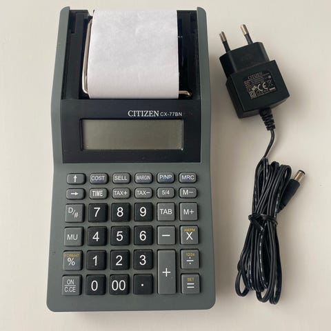 Ibico 1002 regnemaskine med indbygget printer og stort display. Har mange funktionsknapper til batterier jeg har ikke nogen papirrulle til den