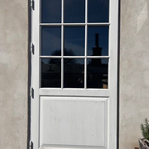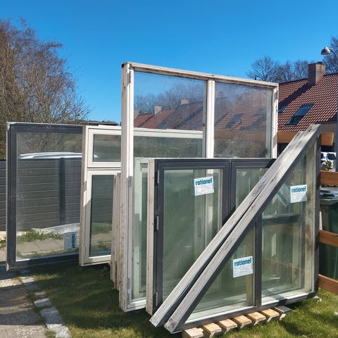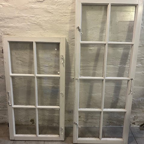 Hvide dobbelte terrassedøre med glasfelter.