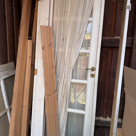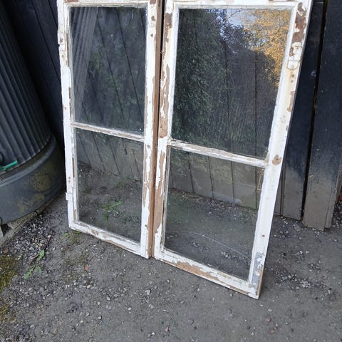 Hvide dobbelte terrassedøre med store glasfelter og træramme. Har greb og beslag monteret samt mindre fyldningsfelter nederst.