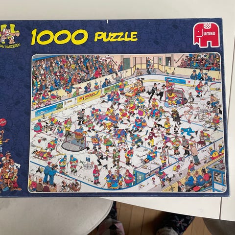 Sjovt Jumbo puslespil med 1000 brikker og farverigt cirkusmotiv fyldt med detaljer. Æsken viser også andre motiver fra samme serie på bagsiden. Jan van haasteren comic puzzle