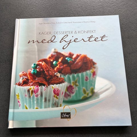 Fin bagebog “Kager, desserter & konfekt med hjertet” med masser af opskrifter på søde sager. Hårdt omslag med flotte kagebilleder og tydelig tekst. Har bare stået i skabet da vi har to.