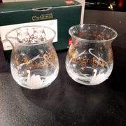 Fine Holmegaard Christmas Crystal lysestager med små røde hjerter. Sælges samlet som to æsker med hver to glasstager til julestemning på bordet.