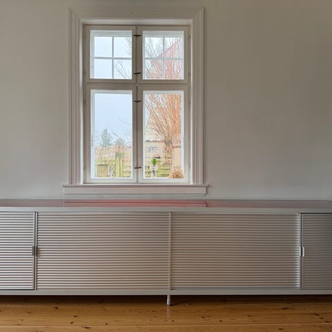 Skænk og mediemøbel fra FK Møbelsdesign. Bedste snedkerkvalitet i eg med sort frontparti. Har to låger der er stofbeklædt, så router og andet wi-fi udstyr kan skjules og to midterpartier med rummelige skuffer. Vægophæng medfølger. Kan også monteres med ben.