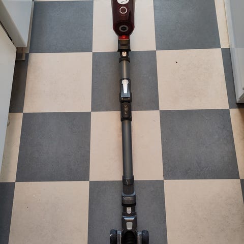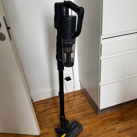 OBH Nordica ledningsfri støvsuger med beholder og langt rør, så den er nem at køre rundt med. Der følger flere mundstykker og børstehoveder med til gulv og hjørner.