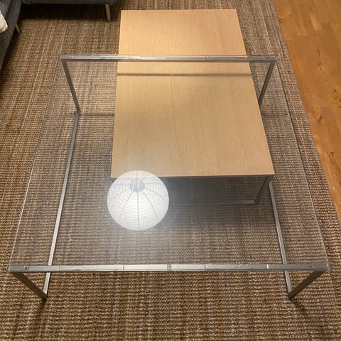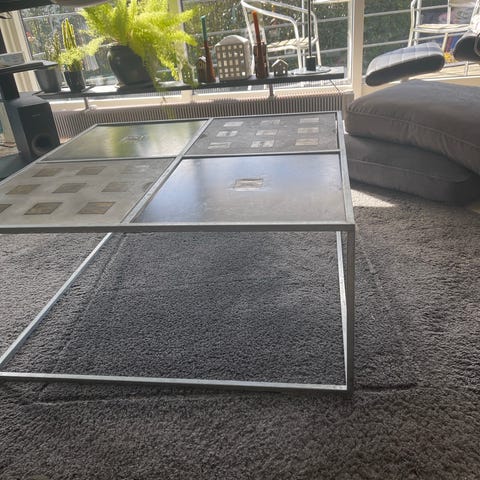 Bordet er i pæn brugt stand med almindelige brugsridser på glaspladen (ikke noget der påvirker funktion eller helhedsindtryk).