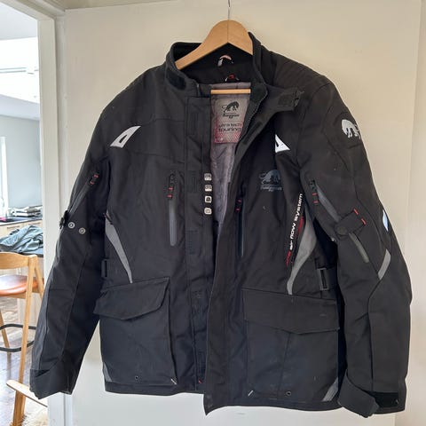 Med beskyttelsesrum og ventilation. Smækbukser med udtagelige termofor. Sammenlignes med motorcykeljakke, som jeg også har til salg.