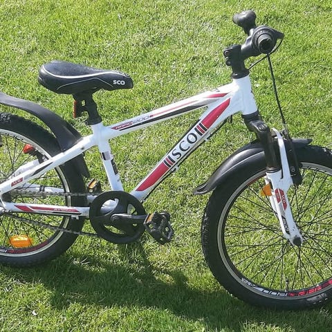 Ghost børnecykel med 20" hjul, sort stel med gule detaljer og gear. Har forgaffel med affjedring og håndbremser foran og bagpå.