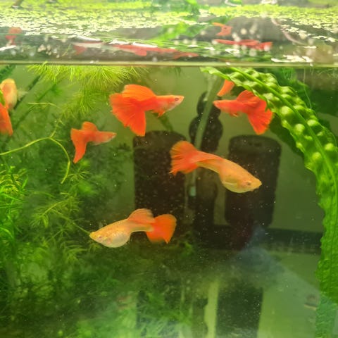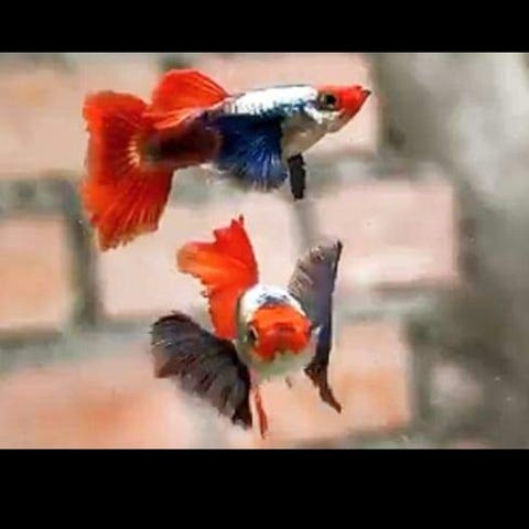 Jeg har en overskud af omkring 15 teenagers guppy, som fik farver og blev til en mini kopi af sine forældre.