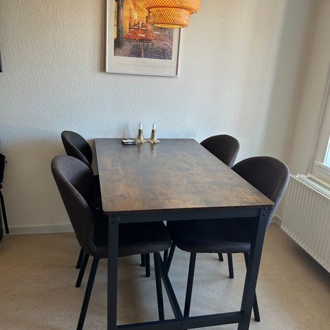 Flot og solidt spisebord med sort stel og mørk træbordplade.