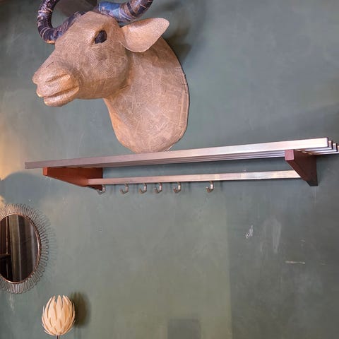 Lang teak hattehylde på 200 cm. med fin patina.