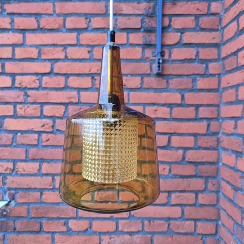 Vitrika loftlampe i messing og ravfarvet glas