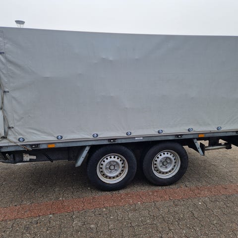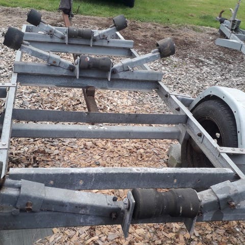 Galvaniseret båe trailer med store terrængående hjul. Har trækstang foran og justerbare beslag på rammen, klar til at blive bygget op efter eget behov. Har været brugt til 30 “ motorbåd på 5,5 ton, bredde 2400 mm længde uden trækstang 4400 mm
