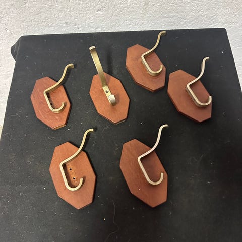 Sælger arvesølvet i form af teak knagerækker af massivt teaktræ mv. med messing kroge, samt børneknagerækker som har ligget på en gård i en menneskealder.