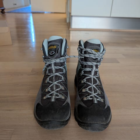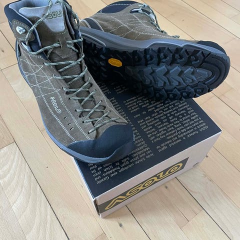 Brune Vivobarefoot vandrestøvler i str 42 med røde snørebånd og grov gummisål. Har højt skaft med snørelukning og forstærket kant rundt om foden.