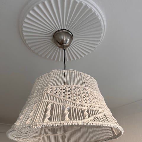 Brugt, men fin vintage lyseblå Laura Ashley Home loftslampe til børneværelset med stjernehulmønster, blå kantbånd og usynlige snore med blå stjerne i forskellige farver, som hænger ned fra lampen.