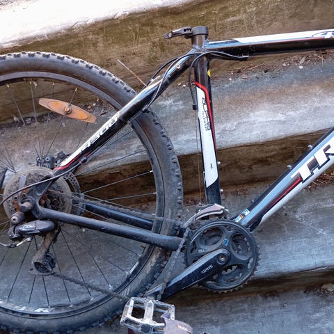 Blå mountainbike med brede dæk og skivebremser foran. Har støtteben, flade pedaler og gear på styret.