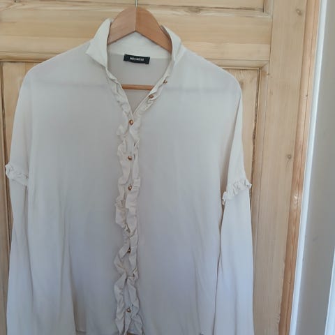 Fin ældre Mos Mosh skjorte der bare har hængt i skabet længe og kun været brugt få gange. Jeg har fjernet mærket men det er en str. S og jeg mener det er silke eller en silke blanding. Bærestykke, krave og knappekant er i andet materiale, se billeder.