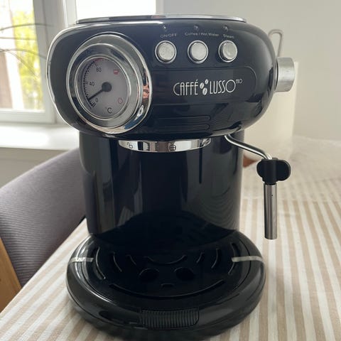 Lusso espressomaskine i sort med trykmåler på fronten. Med aftagelig vandbeholder bagpå og metaldrypbakke under bryggehovedet. Den er pakket ud men aldrig brugt.