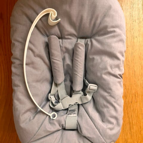 Babybjörn skråstol i brun quiltet betræk. Har justerbar metalramme og strop foran til at spænde baby fast.