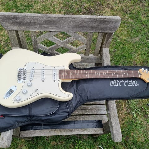 Guitaren er Rengjort , smurt , trimmet og justeret klar til at spille .er 100% i orden med lav aktion og intornering og selvfølgelig med vibratoarm .