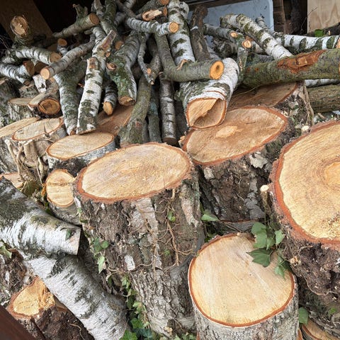 Jeg har fået fældet to store egetræer. De er blevet skåret op i meter lange kævler. De sælges som brænde.