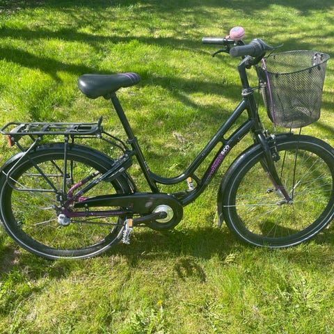 Fin MBK børnecykel med 20" hjul i sort med lav indstigning. Har kurv foran, bagagebærer, skærme og håndbremser.