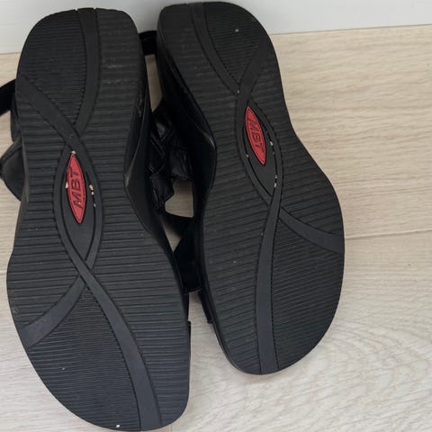 FitFlop sandaler i sort med tårem tror det er str. 38, men kan ikke se størrelsen. Har blød fodseng og kraftig sål med rund rød detalje under bunden.