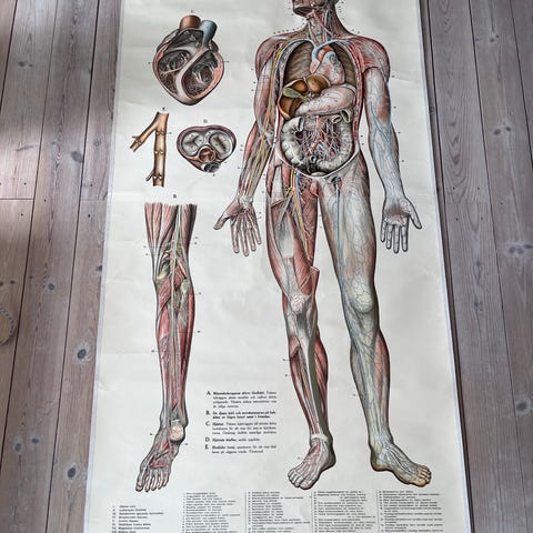 Meget gammel anatomisk undervisningstavle / billede med fine illustrationer og fortegnelse over menneskets nervesystem. Af Baur og Fischer - produceret hos Brinkmann’s Forlag København. Fremstår i god stand med en del overflade patina. Flot som et anderledes indslag på billedevæggen / i indretningen og et musthave for den medicinstuderende / lægen