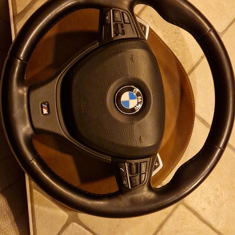 BMW rat med multifunktionsknapper i læder og sølvdetaljer. Har knapper til lyd/telefon og ledningsstik bagpå klar til montering.