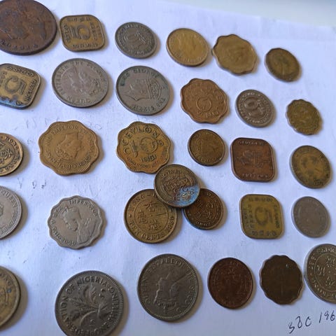 Der er i alt 68 forskellige mønter med en værdi på næsten 65 kr. og en vurderingspris på 545 kr.
